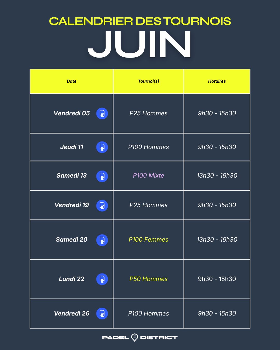 Les tournois de juinTournois de juin Niveaux P25 à P500 Bar / Snacking possible sur place Lots pour les vainqueurs Pour les P250 et P500, inscriptions via Media PadelA partir de 20€/joueurParticiper